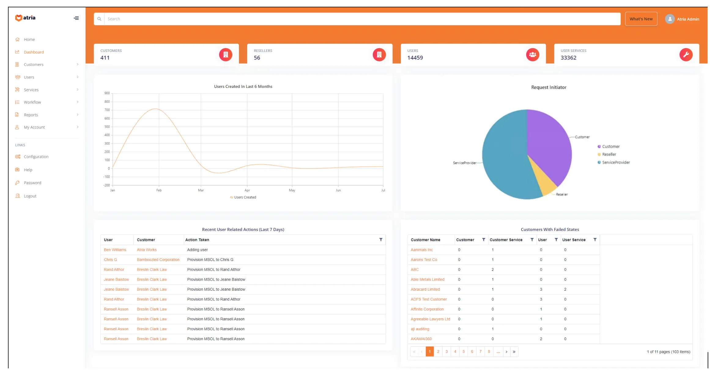 Request Initiator – Who has been working in Atria A pie chart which shows the proportion of requests made through Atria by Customer type (Service Provider, Reseller, Customer) Our goal is to help your resellers and customers be self-sufficient, Existing deployments of the dashboard show end-customers handling over 40% of provisioning operations. Keen to hear your results.